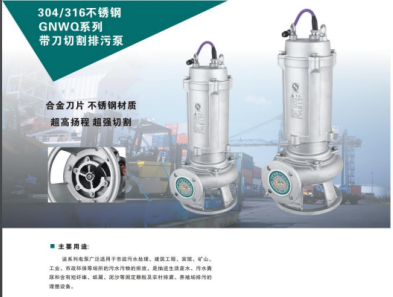304.316不銹鋼GNWQ系列帶刀切割排污泵。葉輪具有獨特的螺旋式結構及帶鋒利刀口設計,在保證永利性能的高效且超過同類產品的同時,兼具卓越的切割能力,能夠保證稻草,棉,布等廢棄物切碎后完全排出,不堵塞。
