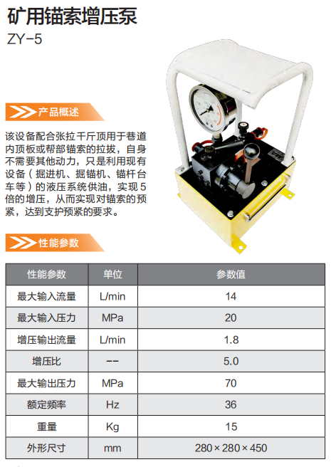 礦用錨索增壓泵。該設(shè)備配合張拉千斤頂用于巷道內(nèi)頂板或幫部錨索的拉拔,自身不需要其他動(dòng)力,只是利用現(xiàn)有設(shè)備(掘進(jìn)機(jī),掘錨機(jī),錨桿臺(tái)車等)的液壓系統(tǒng)供油,實(shí)現(xiàn)5倍的增壓,從而實(shí)現(xiàn)對(duì)錨索的預(yù)警,達(dá)到支護(hù)預(yù)警的要求。
